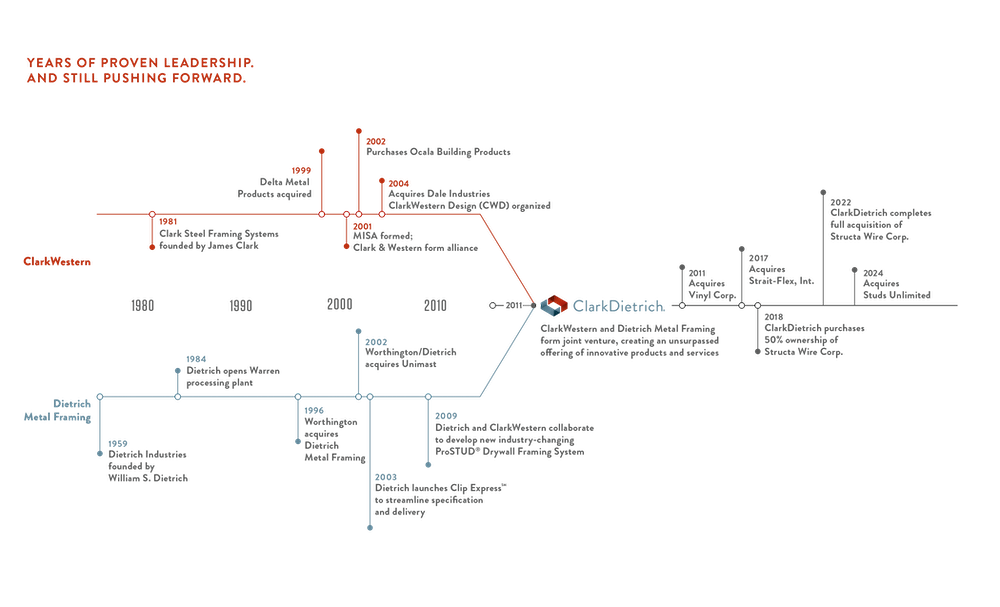 More than simply company milestones, these events have shaped an industry. We invite you to see the significant impact our innovations, products and advocacy for steel framing have made over the years. In doing so, you’ll find compelling reasons to choose ClarkDietrich today.